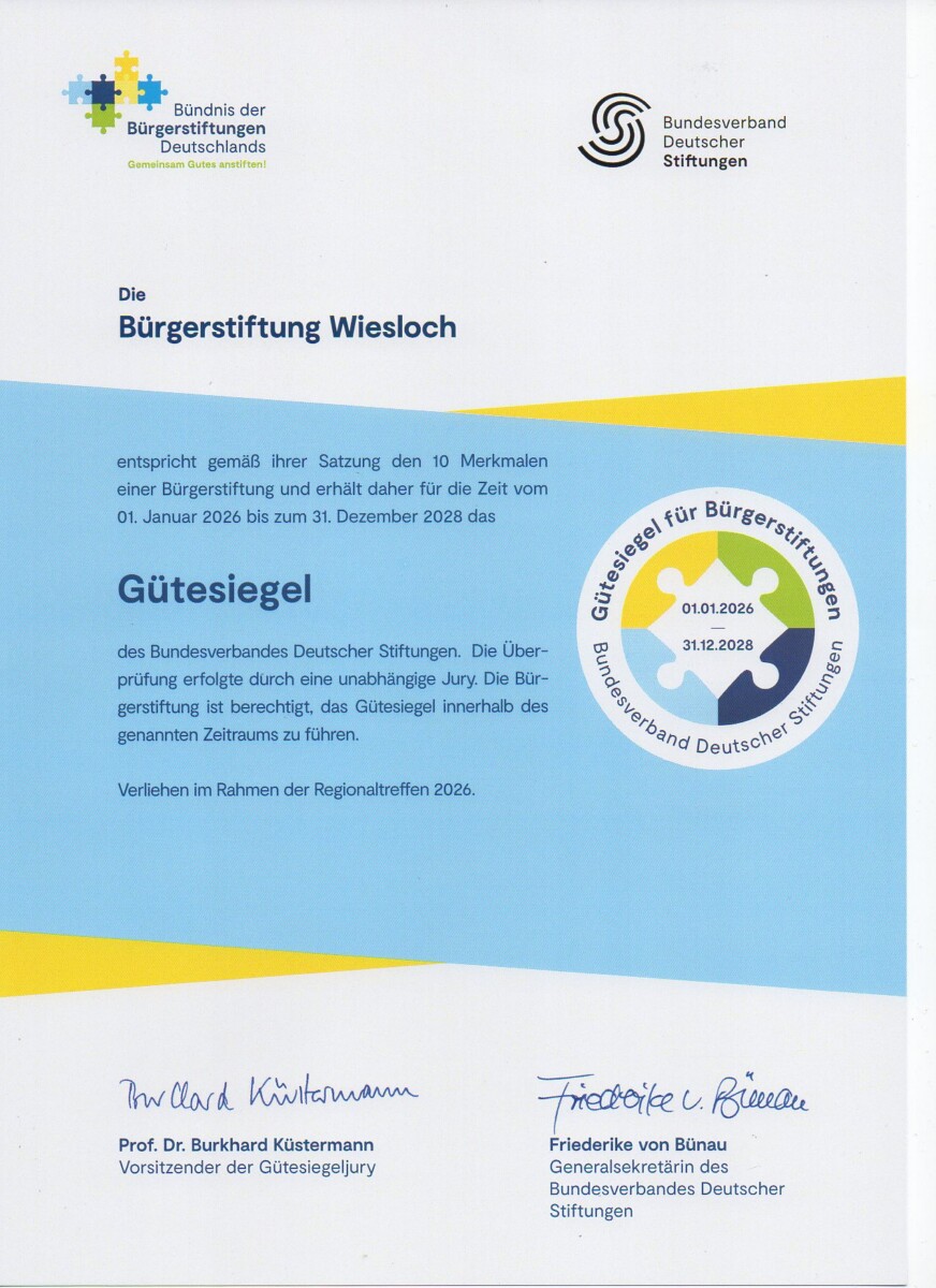 Im Januar hatten wir bereits darüber berichtet, dass die Bürgerstiftung Wiesloch erneut mit dem Gütesiegel für Bürgerstiftungen ausgezeichnet wurde. Das Gütesiegel steht bundesweit für Qualität, Transparenz und Verantwortungsbewusstsein im lokalen bürgerschaftlichen Engagement.